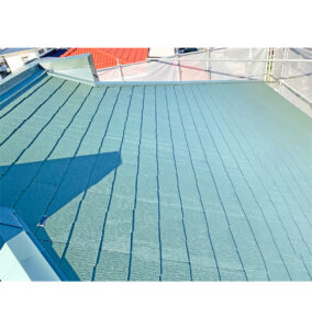 勾配が小さいのでコロニアル屋根を葺き替えではなく板金を重ねて施工しました。